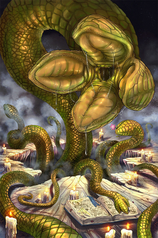 “Cc-rreee-eeaaa-tuuu-rreee…” Comes a set of forced syllables, the first sounds to break the long session of wet slithering and heated breathing that’d come before. It slides further around your neck, allowing it to push into your line of sight again, and in the midst of the horny haze it’s put you in, those four fronds gently twist and flex as though trying to form a smile.