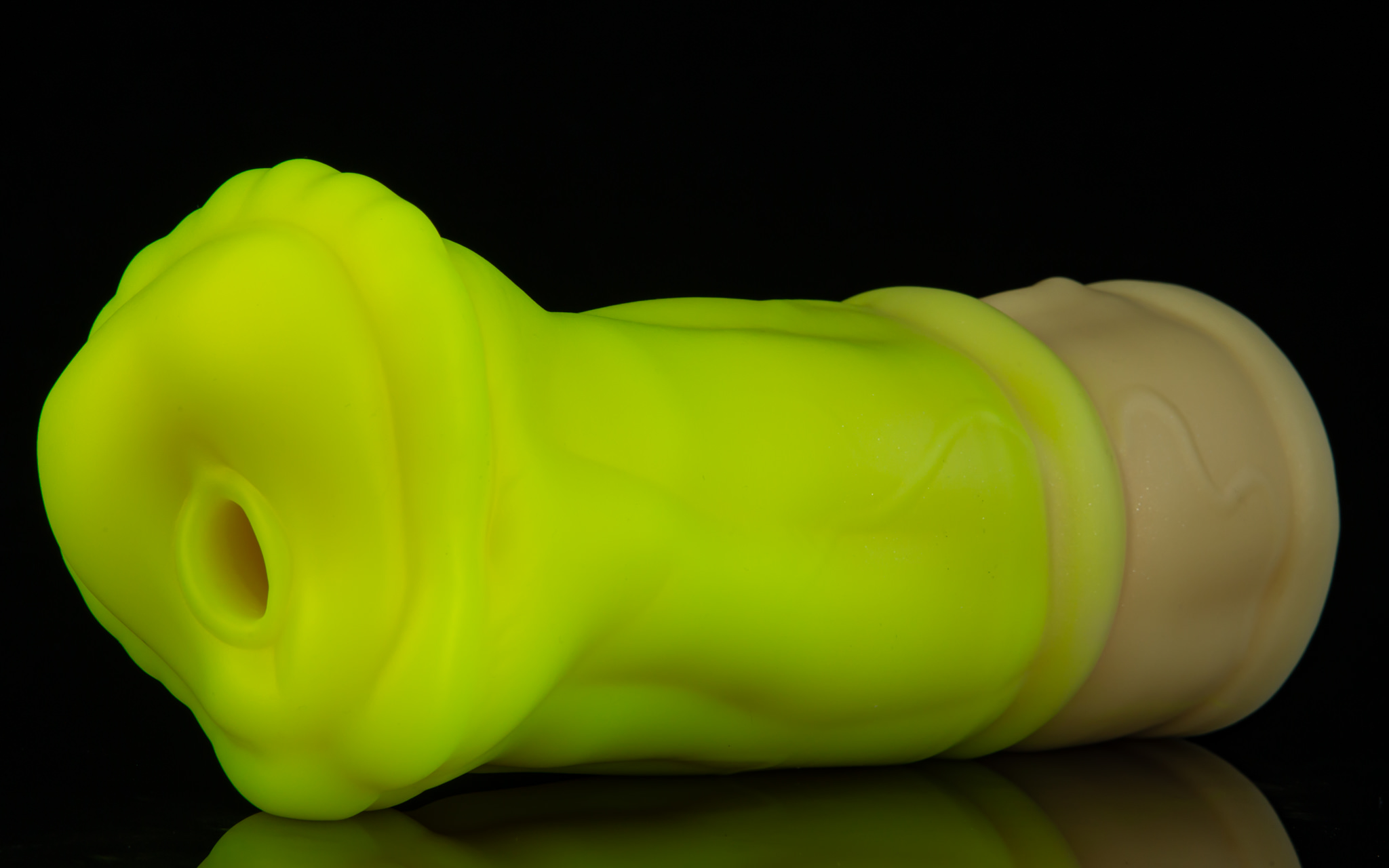 The entrance in his flare quickly opens up into a broader urethral tunnel, which is smooth, but lightly rippled with a delicate skin texture. If you slip past his medial ring, you’ll feel it squeeze over you before opening up further into his depths. By the time you hilt, his broad, flat flare presses squarely to your crotch.