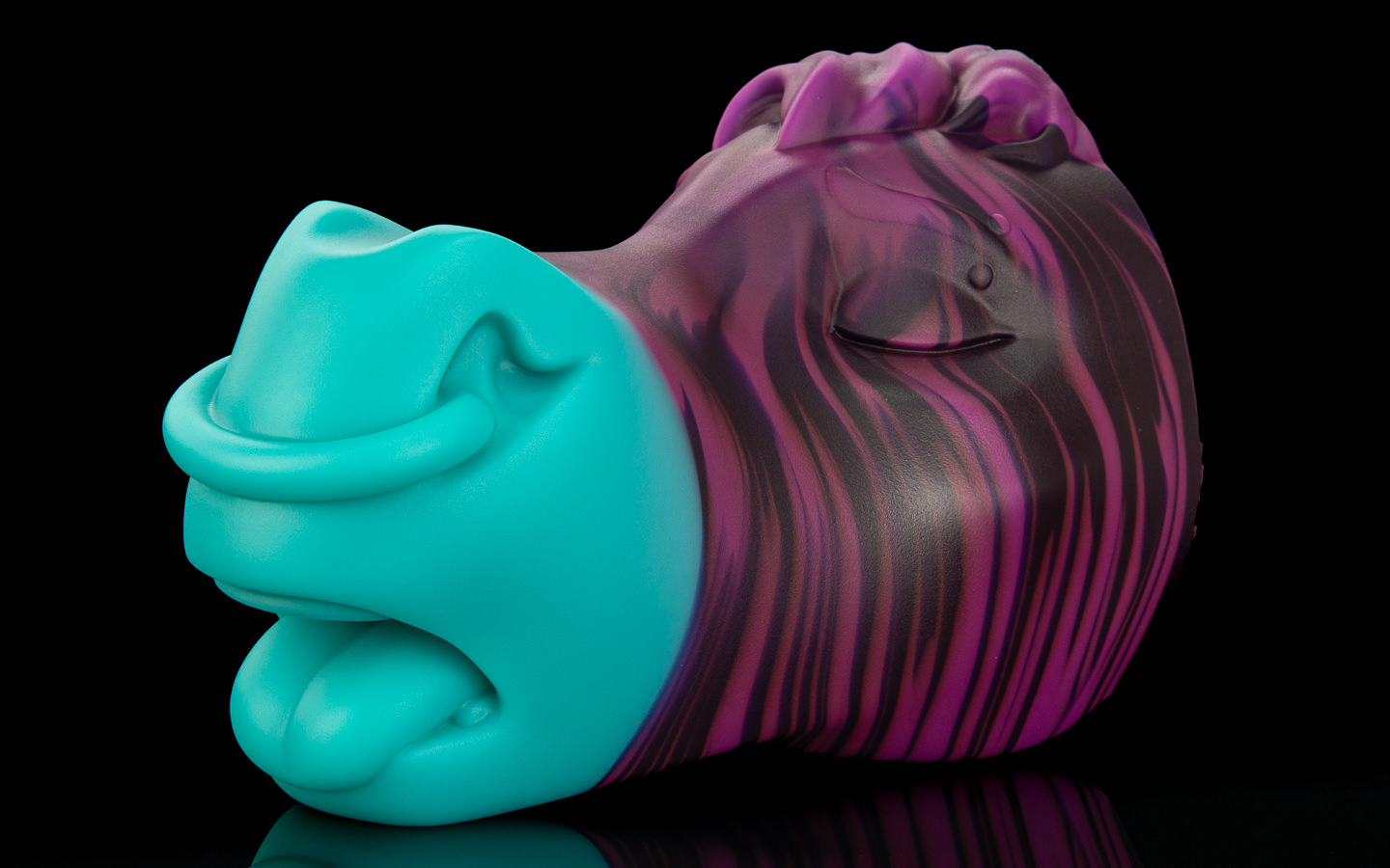 A cute unicorn colouration; His face is swirled between a sparkling white, purple and sky blue before smoothly transitioning to a pink muzzle.