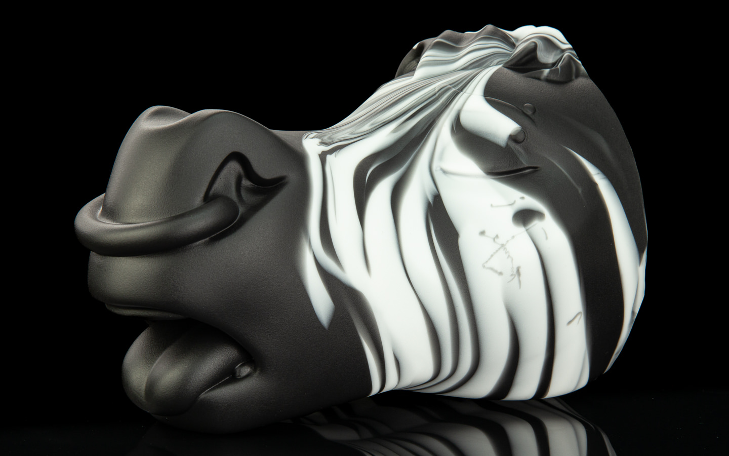 A cute unicorn colouration; His face is swirled between a sparkling white, purple and sky blue before smoothly transitioning to a pink muzzle.