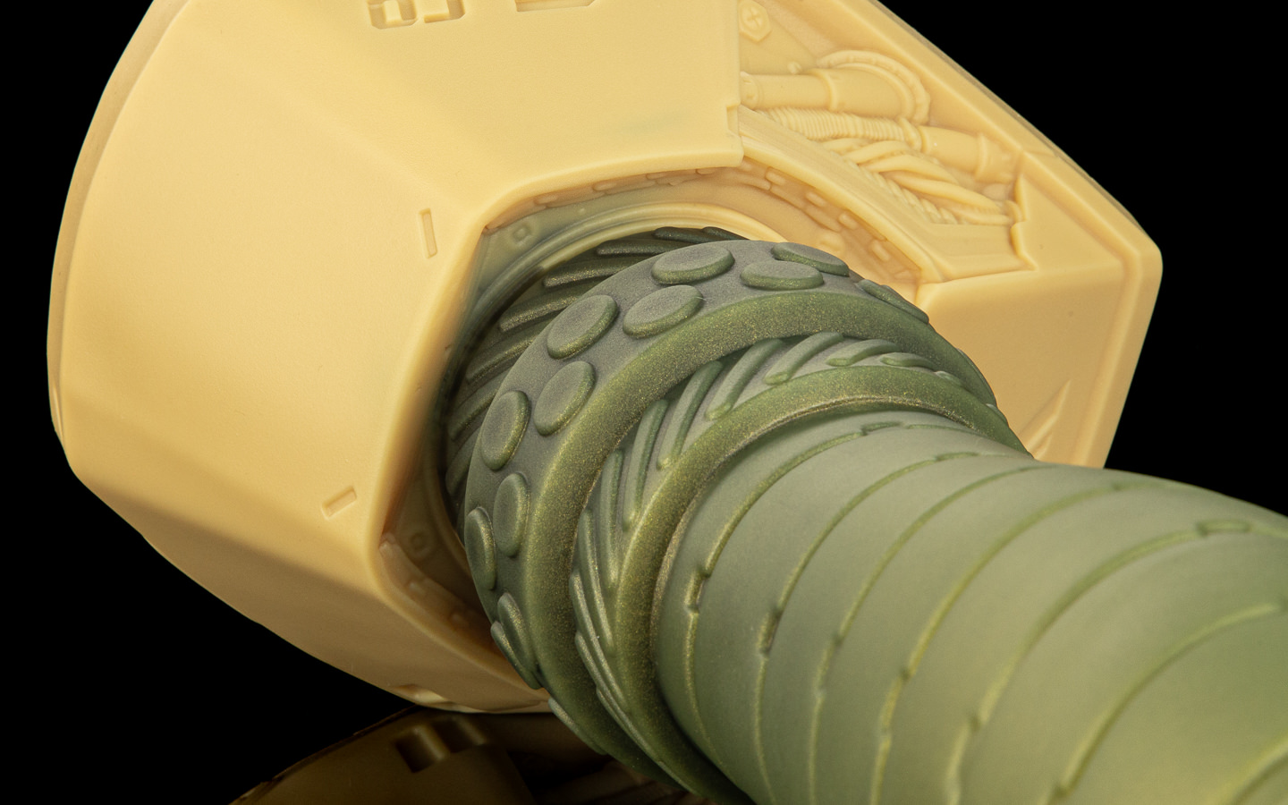 Milo worked methodically; removed the blanking plate from Scout’s ventral port, routed the purpose-built cables - power, data, hydraulic lines. As each connection seated, the shaft responded in stages, first a cyan glow traveling up the length, then internal coils warming it against Milo’s gloved paws. Then, a distinct flex and pulse when the last hydraulic quick-connect snapped home. It was kind of uncanny - despite looking obviously synthetic, it had an organic feel to it. The lynx felt an unexpected heat bloom between his legs.