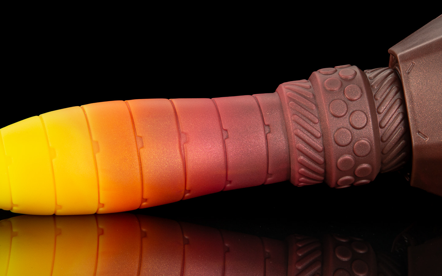 The base is a dark steel and red swirl.