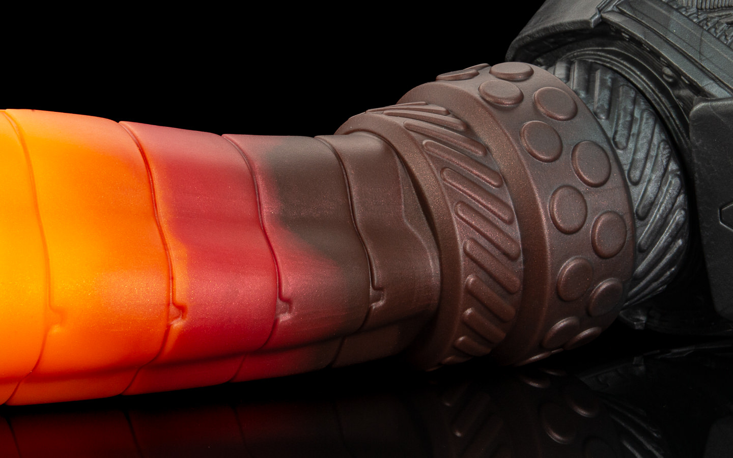 The base is a dark steel and red swirl.