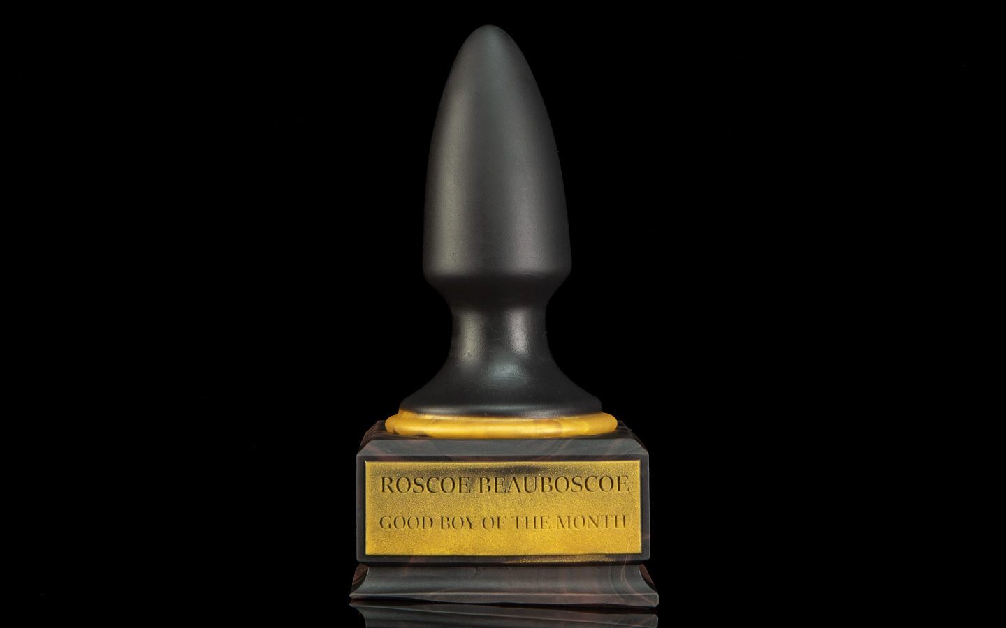 We wanted this toy to be as accurate as possible, so our production staff have gone above and beyond; the “plug”, plaque and gold ring are all poured separately from black and gold silicone, then the base is poured using a black and brown swirl to emulate wood texture. In person, it hardly even looks like its entirely silicone until you pick it up.