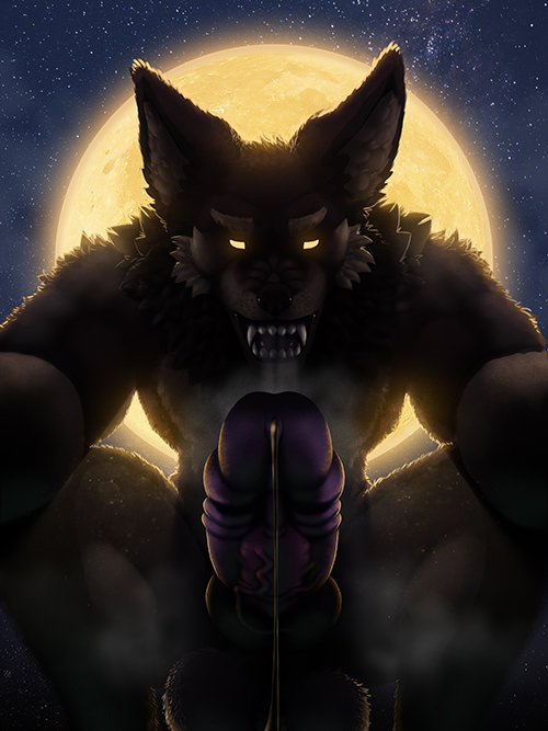 Normally in werewolf movies, the moon would be perfectly placed to ring the head, showing off the bestial jaws and the slavering fangs and the crazed eyes. This, however, isn’t one of those movies. Instead, the moon shines bright between the werewolf’s legs as he stands erect. Well, not completely erect, because dangling down into the moonlight is the most intimidating cock you’ve ever seen. It’s thick and throbbing in silhouette, and you can see a wayward drip detach itself from its head and splash down onto the roof. Swaying in the moonlight just behind that is an impressive pair of nuts, furry and tufted with glimmers of the light shining through the thick pelt.